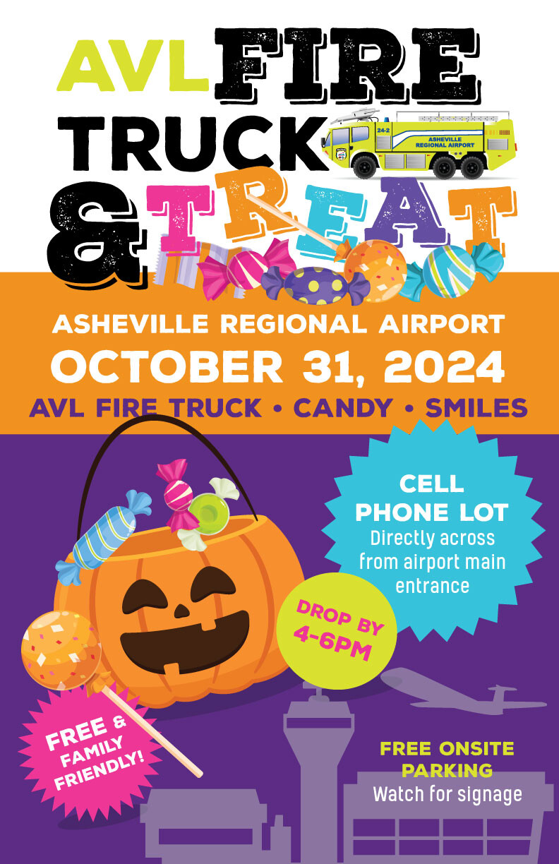 This special drop-by event offers a unique opportunity for children to visit the airport and check out AVL's impressive Aircraft Rescue and Fire Fighting truck, meet the airport’s friendly fire fighters, police officers and Paws for Passengers volunteers, and do a little trick-or-treating.